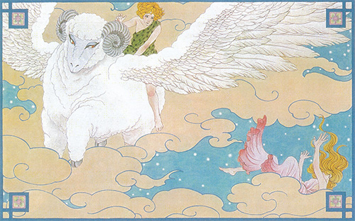 - 12宮星座のゆえんを書いた文にそえられた12枚のイラスト。(そえられたというよりメインですね)動物や人物の表情が、実際のギリシア芸術のものと近い感じを受けます。全体的に淡い色が基調で、そのあたりがなんとなく星占いのイメージ。遠い昔の物語り・壮大な伝説等の話に、内田善美さんの漫画というのは群を抜いて冴えますね。(『増刊ぱふ』1986年vol.2より)